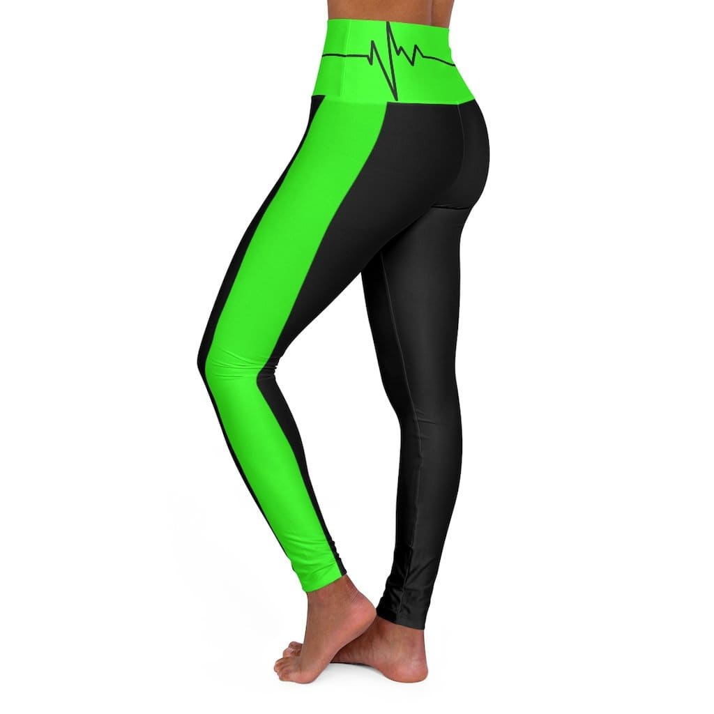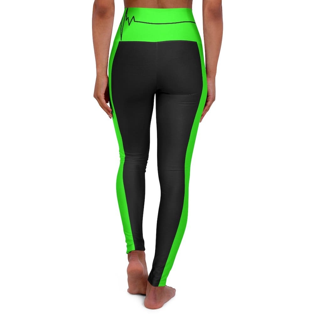 High Waisted Yoga Leggings - Black and Neon Green Beating Heart Sports Pants